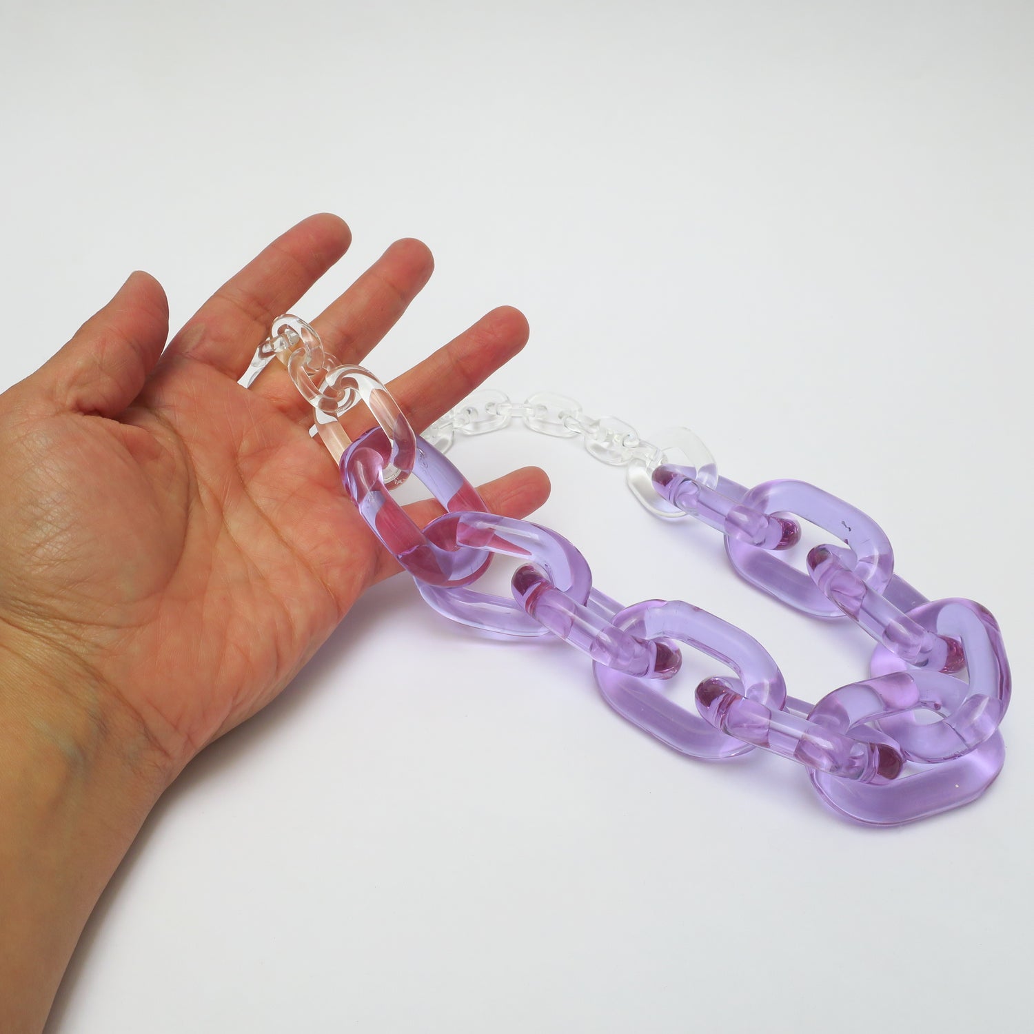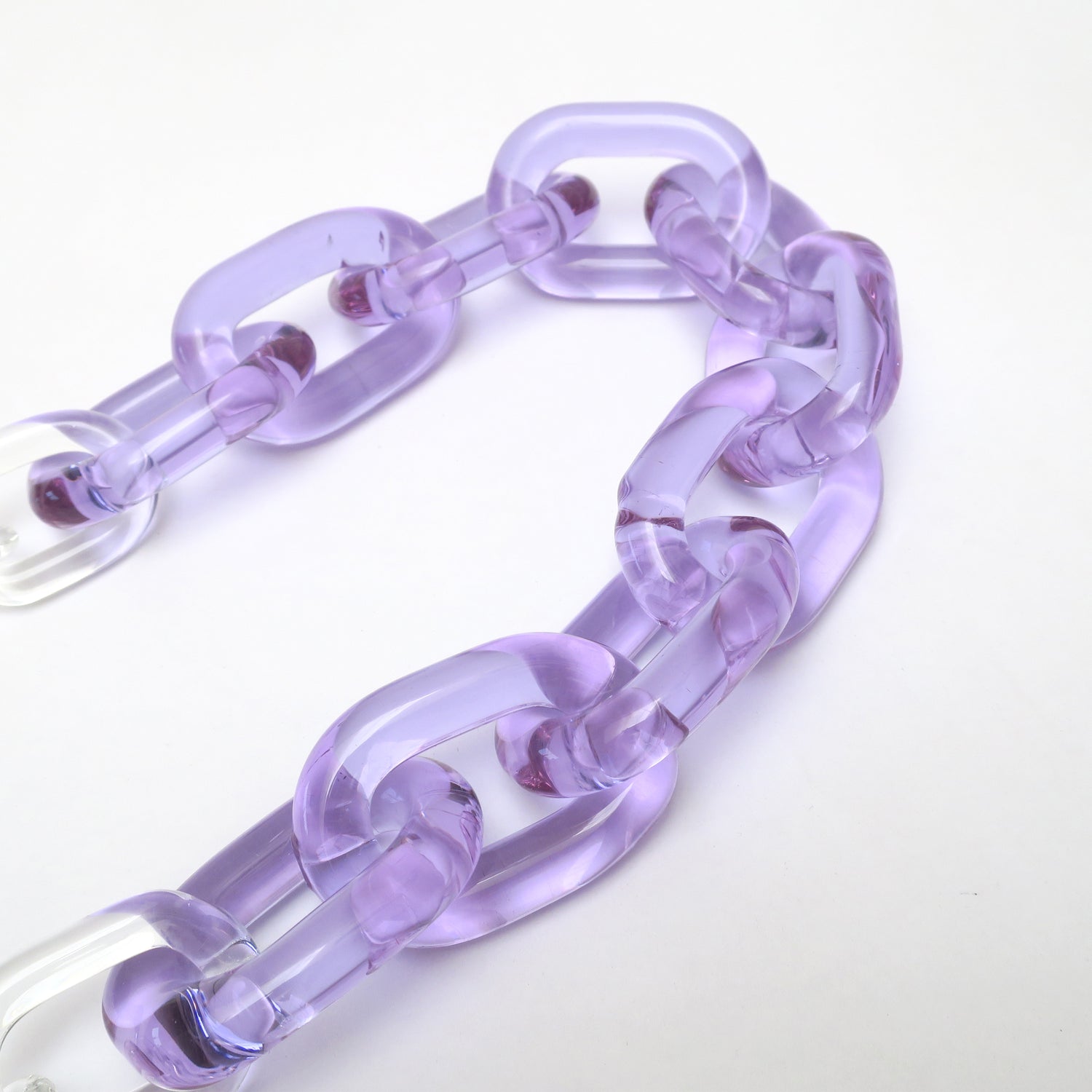 Sus eslabones, completamente hechos a mano en vidrio, crean una presencia fuerte y escultórica sin perder la ligereza que emite del material.