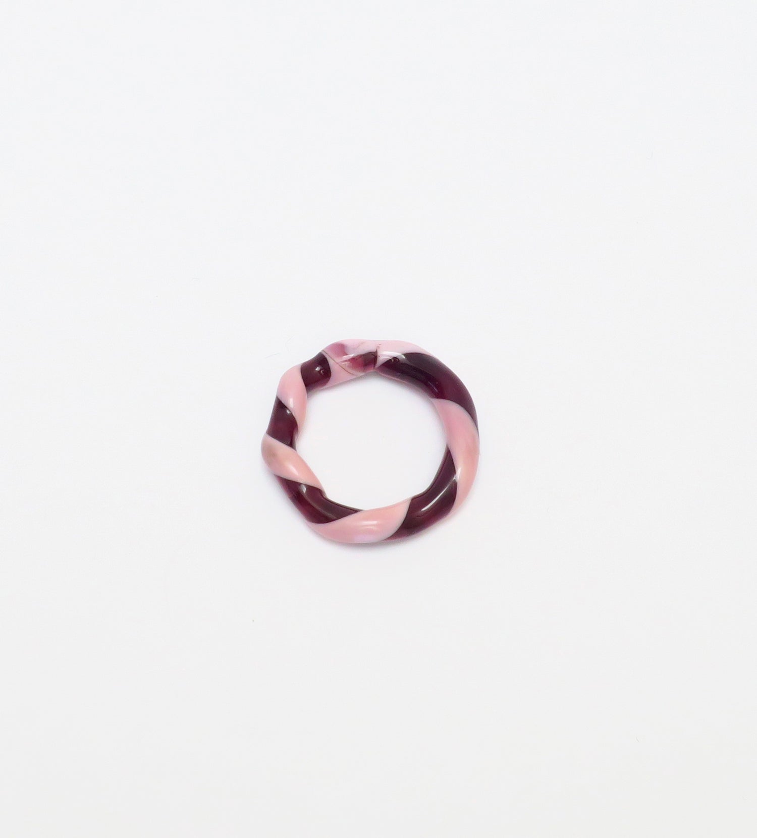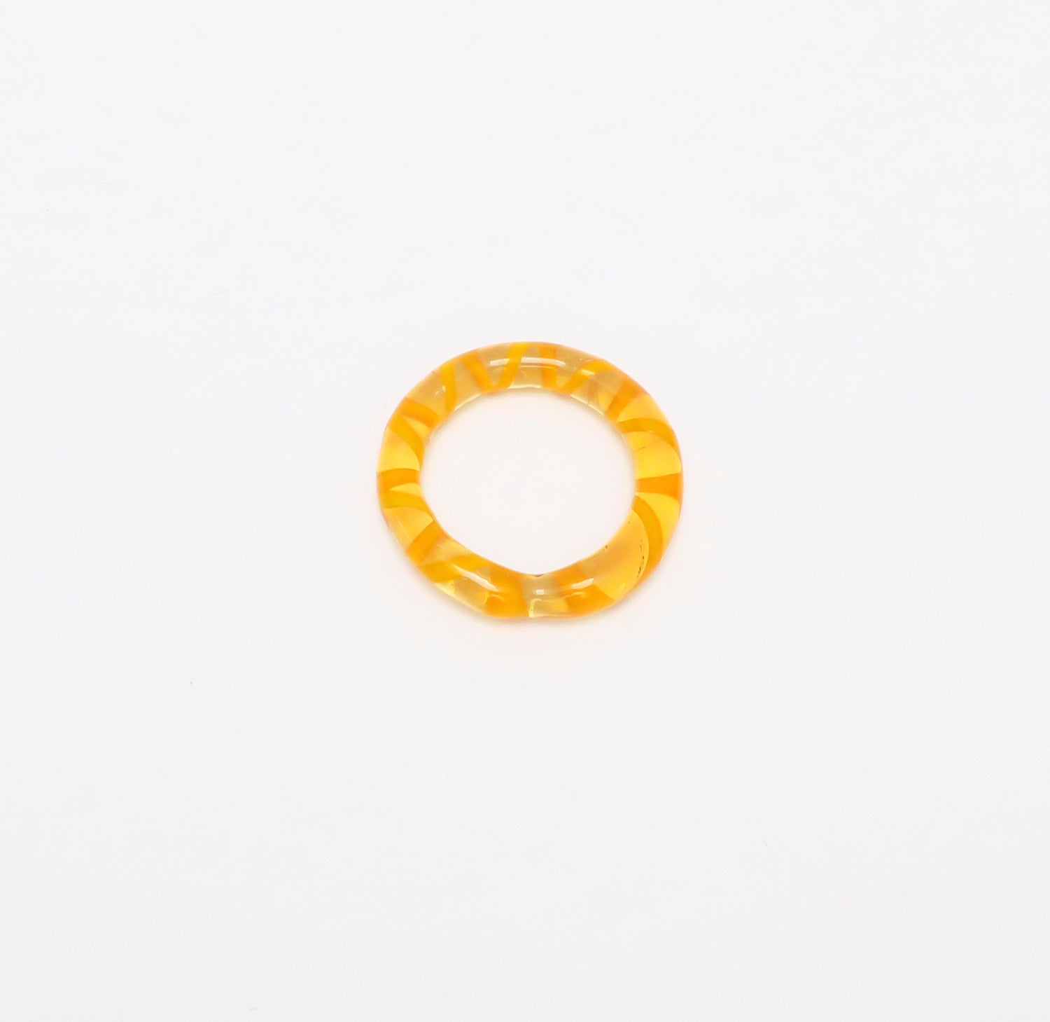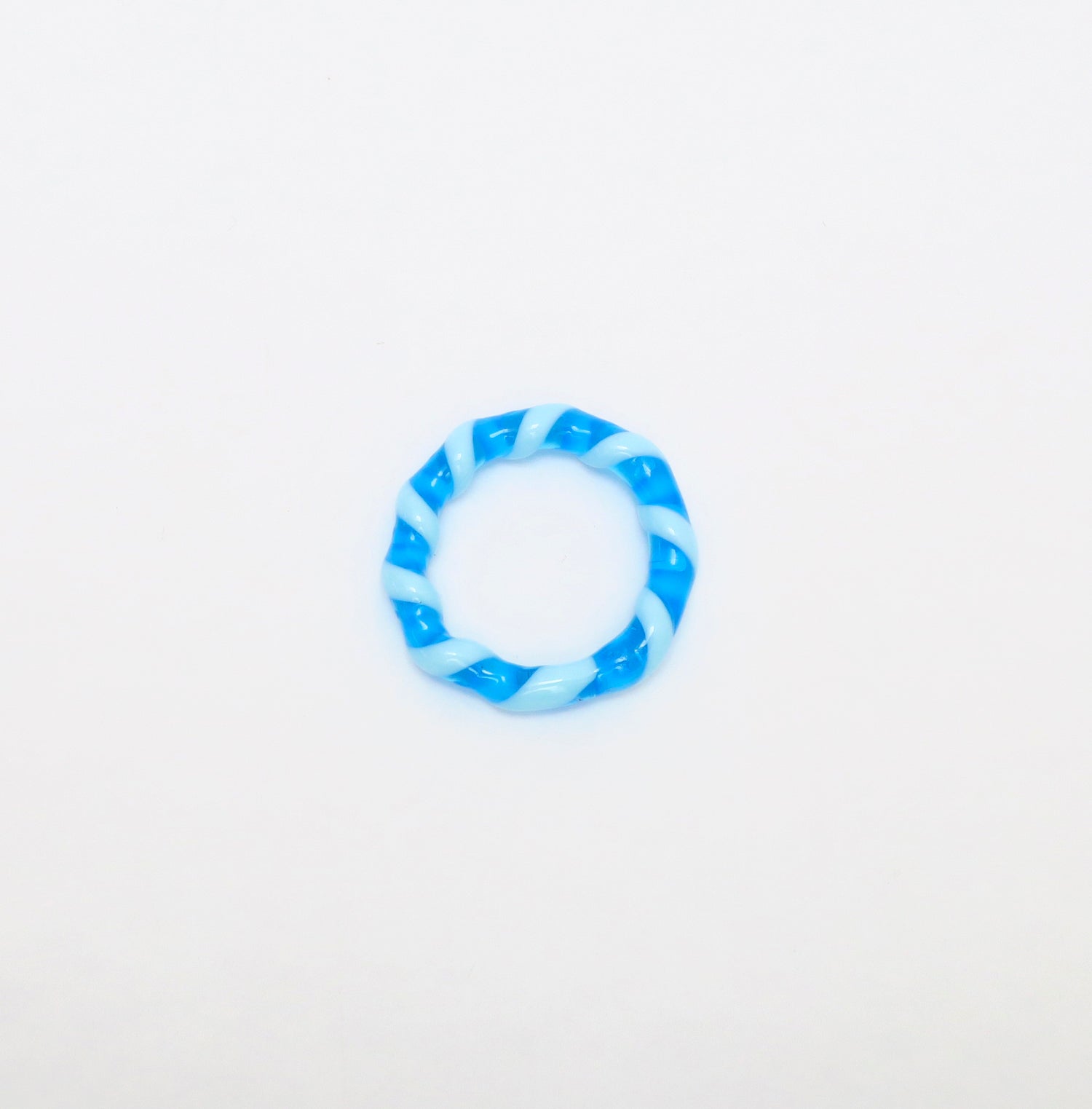Cada anillo nace del encuentro entre dos colores de vidrio que, al estirarse al fuego, se entrelazan en un movimiento de torsión.